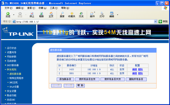 如果您是ADSL宽带接入用户,采用ADSL Modem+路由器模式,直接登录路由器,在“转发规则”的“虚拟服务器”中定义了广域网服务端口和局域网网络服务器之间的映射关系即可,如下图,将数据库服务端口1433和速达3000G-XP工业服务器端口3001端映射到局域网IP为192.168.1.9机器上;