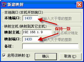 映射端口:该端口必须与“本地端口”保持一致,为1433;