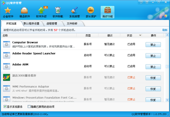 2、 检查QQ软件管理器,360等软件是否设置了禁止启动了速达软件服务器的服务(如下图);