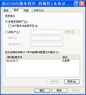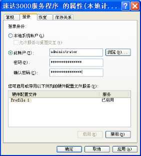 如果不是“已启动”状态,您可以尝试双击“速达3000服务程序”,打开“速达3000服务程序”服务属性窗口,检查“登录身份”是否是选择“本地系统帐户”(如下图1);如果是选择“此帐户”,最好使用系统管理员(Administrator),注意更改该用户密码后一定要记得在这里也要重新设置密码(如下图2)。