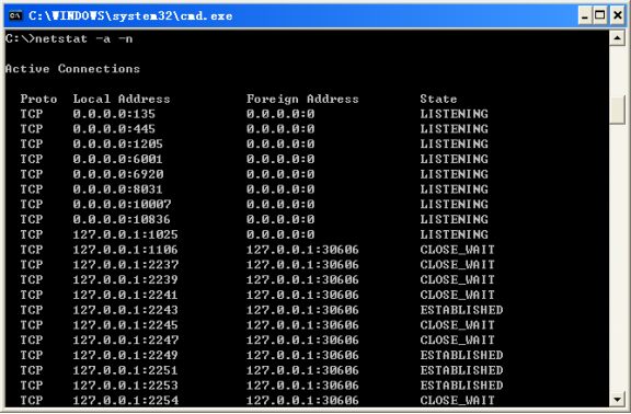 输入:cmd 命令进入DOS窗口,再输入 netstat -a –n 命令,列示所有已用端口,如下图